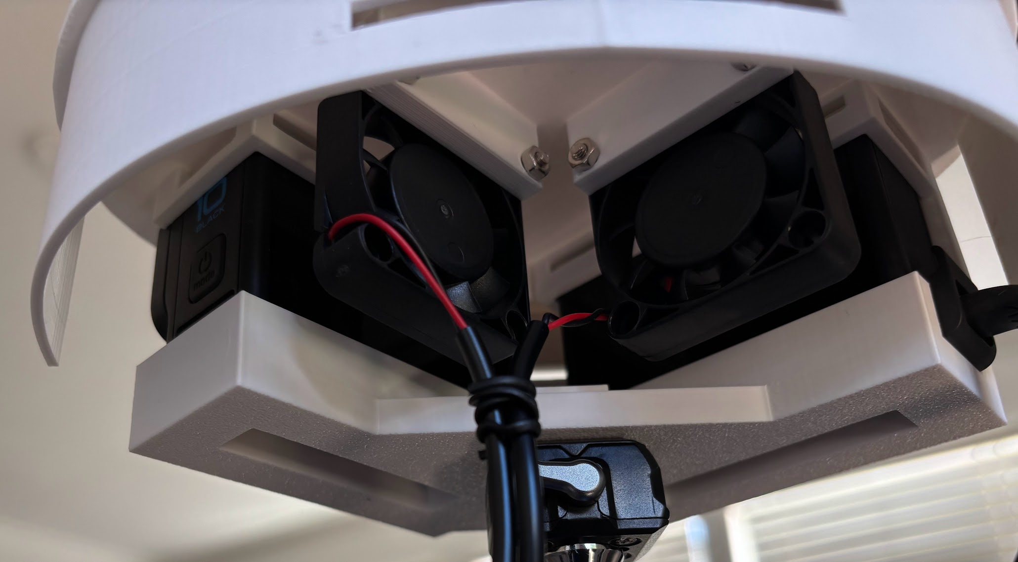 In addition to the top fan, two very small fans are replacing the gopro batteries - they act as heat exchanger, forcing fresh air in a hot air out
